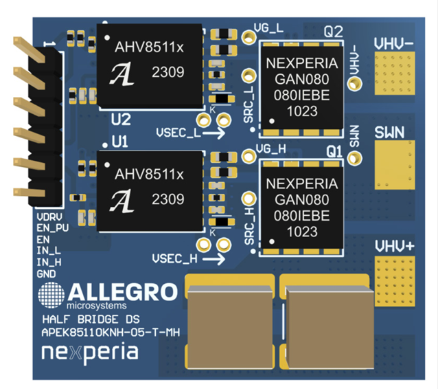 Allegro MicroSystems' half-bridge driver-switch demonstration board APEK85110KNH-05-T-MH contains two Gallium Nitride (GaN) FET drivers and two Nexperia GAN080-650EBE 650 V, 80 mΩ GaN FETs in the DFN8080-8 package. It can be used to perform double-pulse tests or to interface the half bridge to an existing LC power section.