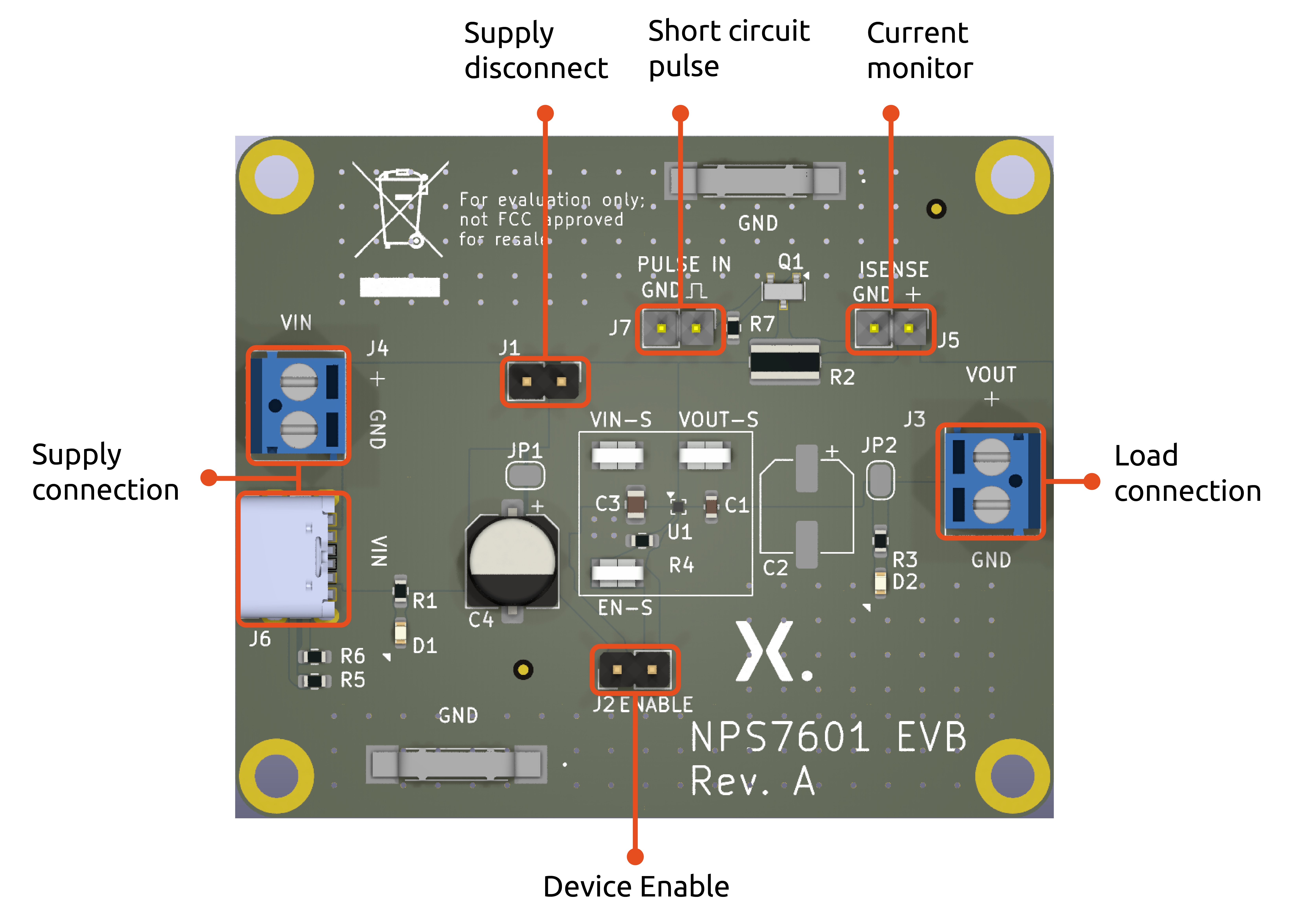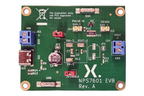 The NEVB-NPS7601 evaluation board is a two-layer PCB with one NPS7601 load switch. It allows users to evaluate the device behavior under different application conditions.