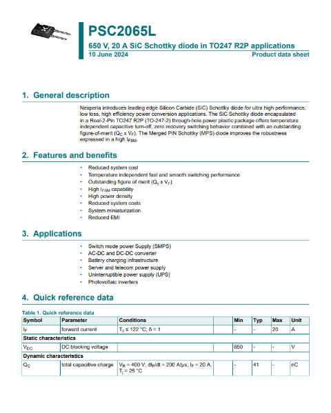 | PSC2065L | 650 V, 20 A SiC Schottky diode in TO247 R2P | Production |